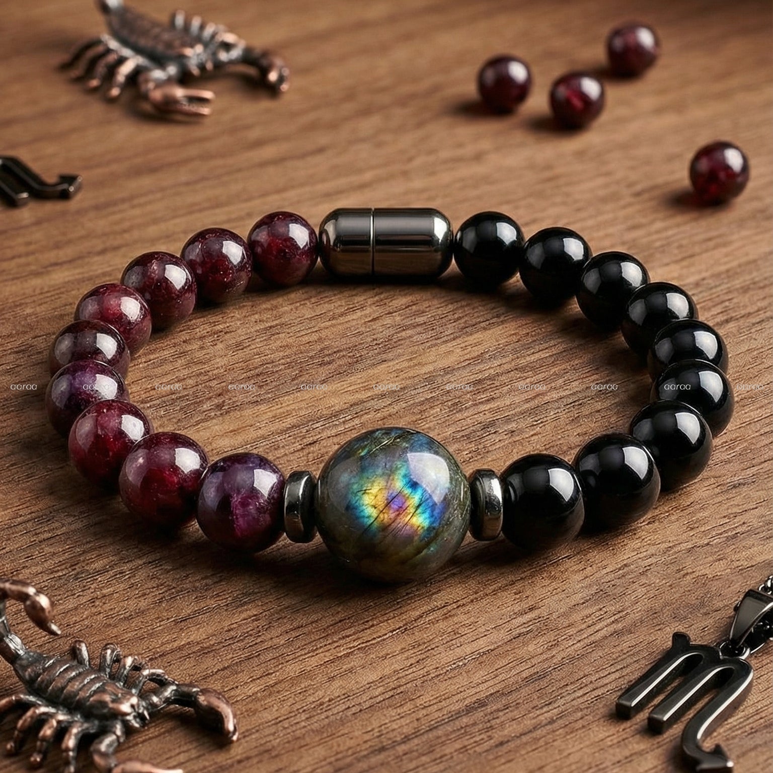 Garnet fuels passion, Black Onyx provides protection, and Labradorite enhances transformation and intuition, aligning with Scorpio’s depth.